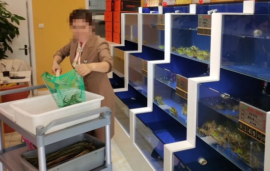▲门店工作人员现场捕捞螃蟹并打包。