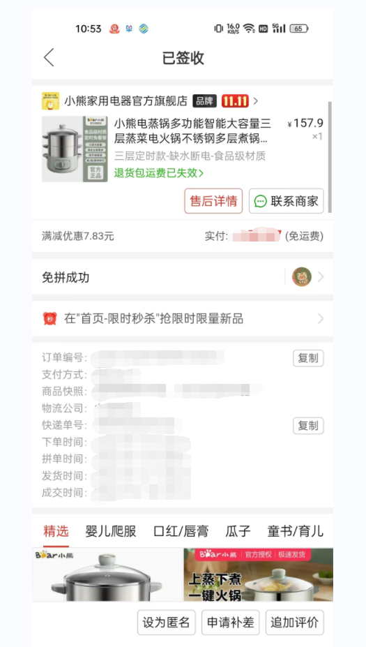 与A女士因为购买后不发货投诉小熊电器不同的是,另一位消费者B女士5月份在拼多多平台的“小熊家用电器官方旗舰店”购买了小熊电蒸锅,但是在使用过程中发现能够从不锈钢容器内部擦出黑色的污渍。B女士要求商家提供检测证书,店家回复“不想要的话麻烦安排退货退款”。