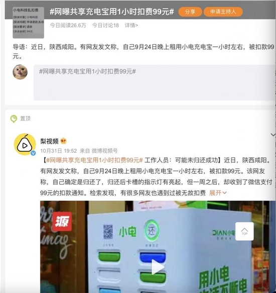 “小电”共享充电宝用1小时扣费99元?回应:或因操作不当致未归还成功