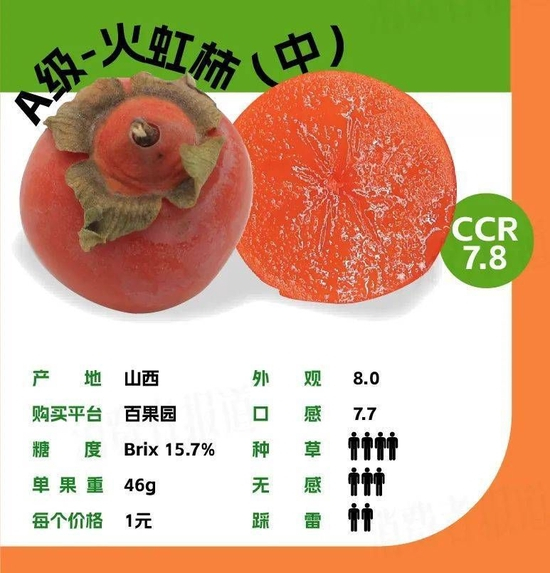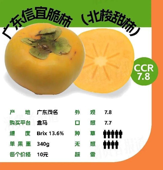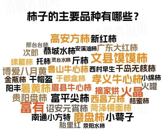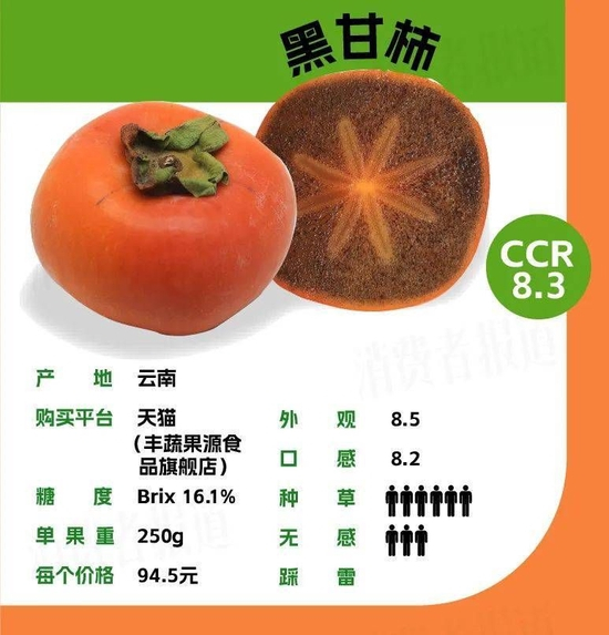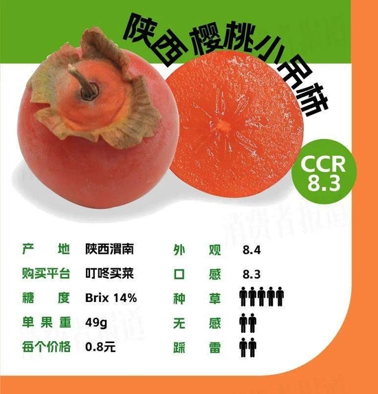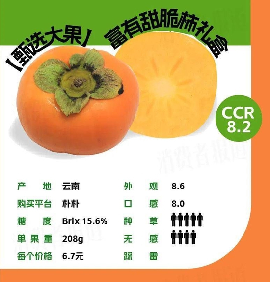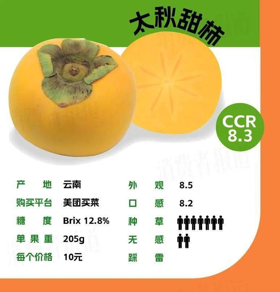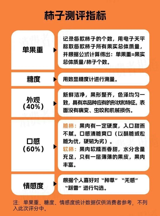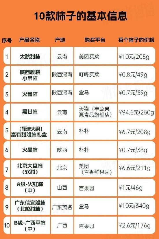 2022年10月,《消费者报道》从多个电商平台购买了10款有代表性的柿子品种,测试了其糖度和单果重。