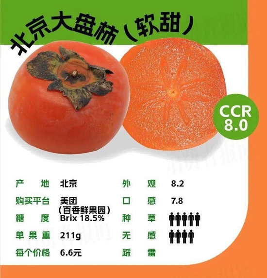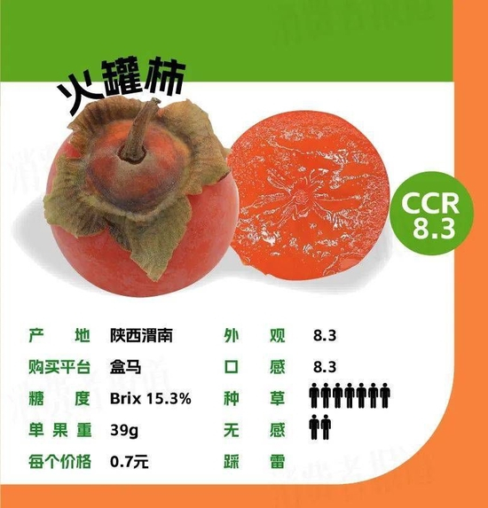 02.柿子是后熟型水果,采摘后未成熟的柿子随着放置时间会慢慢熟透,糖度也会升高,因此本次所测糖度仅代表该成熟度下的柿子糖分。