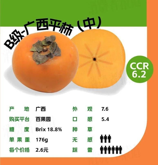 这款广西平柿同样购自百果园,品质没有上文提到的火虹柿高,标称是B级。在此次测评的所有“大”柿子中,广西平柿略显mini,单果重不足200g。