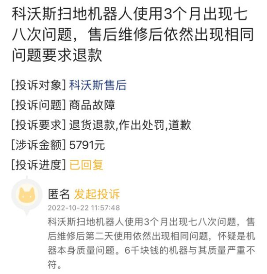 其中一位消费者投诉称,科沃斯扫地机器人在使用的3个月内出现七、八次问题,售后维修第二天仍出现同样的问题,质量与售价严重不符。