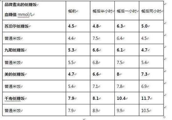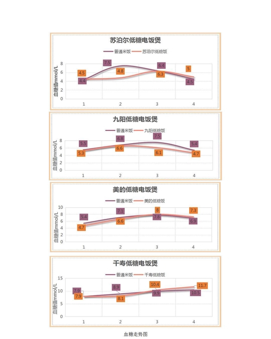 测试分别使用普通电饭煲和调查购买的4款低糖电饭煲,以同样的大米做成米饭。4名体验员分两天食用,每次100g米饭,分别记录餐前血糖、餐后半小时、一小时、两小时的血糖数值。