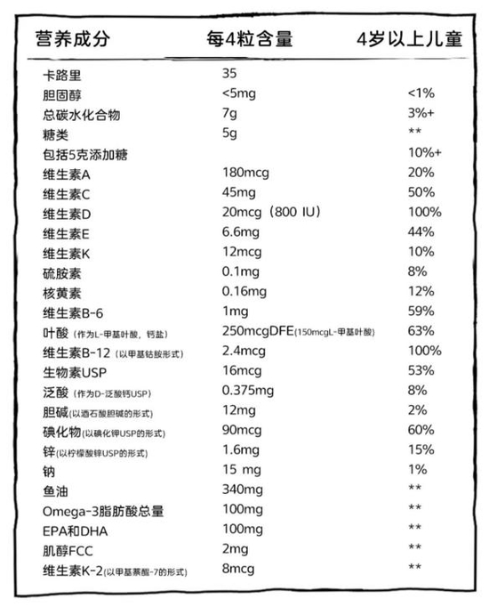 记者注意到,根据“SmartyPants海外旗舰店”公布的产品成分表,联合利华猫头鹰品牌儿童维生素软糖每4粒含有的糖类成分为5g,另包括5g添加糖。而从维生素含量来看,每4粒产品的维生素营养成分含量总和不足53mg。