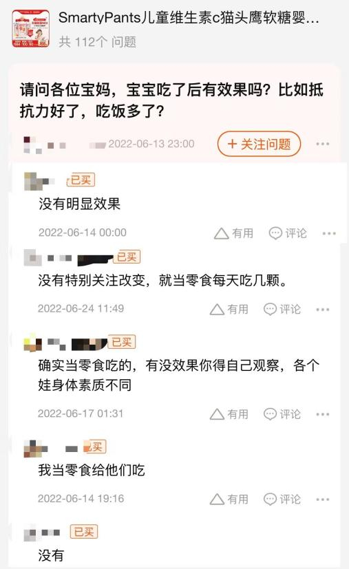 记者注意到,在多个儿童维生素软糖产品评论区,有家长对产品的功效持怀疑态度。一位家长提问称,“宝宝吃了后有效果吗?比如抵抗力好了、吃饭多了?”而在该条提问下方,多位家长回复称“没有明显效果”、“给孩子当零食吃”。
