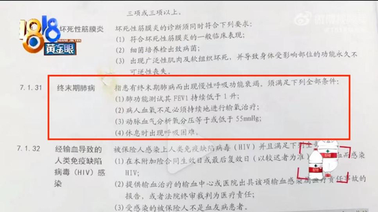 雷女士介绍称,在其签订的保险合同适用的重大疾病列表里,有一项终末期肺病,指患有终末期肺病而出现慢性呼吸功能衰竭,须满足下列全部条件:“1.肺功能测试其FEV1持续低于1升;2.病人血氧不足必须持续地进行输氧治疗;3.动脉血气分析氧分压等于或低于55mmHg;4.休息时出现呼吸困难。”