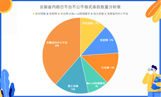 调查结果显示,15家平台共发现88条不公平格式条款内容,约61%的不公平条款来自5家全国性婚恋平台,其中: