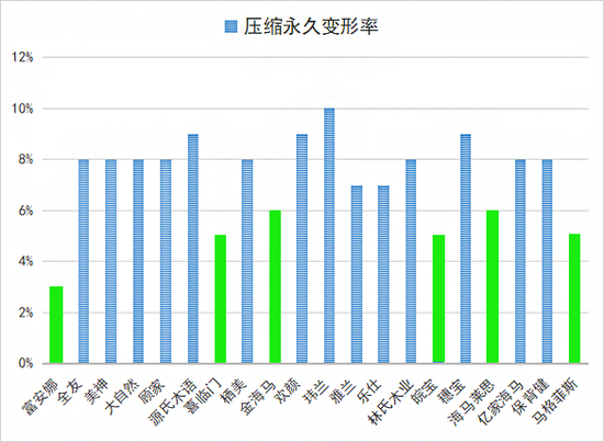 测试结果显示,20款棕纤维弹性床垫样品的含水率、压缩永久变形率均符合GB/T 26706-2011《软体家具 棕纤维弹性床垫》标准要求,其中有6款样品的压缩永久变形率不高于6%(标准规定值为≤12%),表现卓越,分别为富安娜、喜临门、金海马、皖宝、海马莱思、马格菲斯品牌样品。