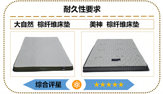 测试结果显示,20款棕纤维弹性床垫样品的耐久性要求均符合GB/T 26706-2011《软体家具 棕纤维弹性床垫》标准要求,其中有2款样品经过30000次耐久性试验后,床垫垫面高度为初始垫面高度的95%以上,表现卓越,获评5星,分别为美神、大自然品牌样品。