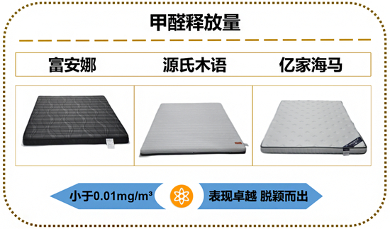 20款棕纤维弹性床垫样品中,有19款样品的甲醛释放量均符合GB/T 35607-2017《绿色产品评价 家具》标准要求,其中3款样品甲醛释放量小于0.01mg/m³,表现卓越,分别为富安娜、源氏木语、亿家海马。