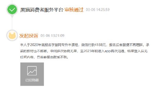 有投诉人表示,本人于2020年底报名学慧网专升本课程,微信付款4188元,报名后客服便不再理睬,承诺的教材也不邮寄,中间多次协商无果,至2023年初进入app再次沟通,结果登入后无任何内容,目前客服也联系不到。