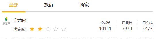 据新浪黑猫投诉平台数据显示,截至2023年3月13日,学慧网共收到投诉10111件,已回复7970件,回复率78.8%;已完成4475件,完成率44.2%。