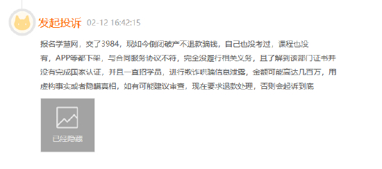 另外还有人表示,报名学慧网,交了3984,现如今倒闭破产不退款骗钱,自己也没考过,课程也没有,APP等都下架,与合同服务协议不符,完全没履行相关义务,且了解到该部门证书并没有完成国家认证,并且一直招学员,进行欺诈哄骗信息泄露,金额可能高达几百万,用虚构事实或者隐瞒真相,如有可能建议审查,现在要求退款处理,否则会起诉到底。