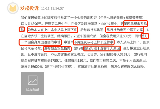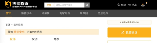 央视315晚会曝光部分景区公共游乐设施存在安全隐患。在黑猫投诉平台上,涉及景区安全的投诉达107单。有消费者表示曾遭遇设施故障被挂在空中半小时无人理会的境况,事后工作人员没有给出合理解决方案,对安全隐患视而不见。还有消费者反馈景区没有事先检查安全措施,马帮未系马鞍导致游客上山途中从马上摔下,事后被要求签订因自身原因退团申请并不得提及从马上摔下的事。