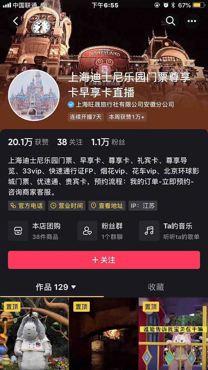 界面新闻在抖音平台上查询到,目前“大智若愚的愚”购买团购所在的商家已经将团购下架,并从企业账号转为个人账号,而南京随享旅行社的迪士尼团购产品还在售卖中。
