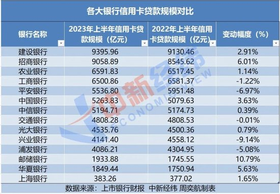 在发卡量和消费额下滑之余,部分银行的信用卡贷款规模也出现了下降的情况。2023年上半年,工商银行、平安银行、交通银行、兴业银行和浦发银行的信用卡贷款规模均较2022年同期有所下滑,降幅分别为1.22%、6.97%、0.01%、9.14%和5.08%。