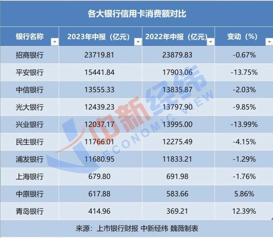 其中,平安银行和兴业银行信用卡消费额同比下降超10%,光大银行同比下降9.85%,民生银行、中信银行等消费额均有不同程度下降。