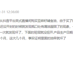 然而,在黑猫投诉、淘宝官方旗舰店等平台中,有不少消费者表示英式辅食有食品安全问题。于2023年12月31日,有消费者在和猫投诉平台控诉,此前购买的英式亚麻籽辅食油还没开封的时候就发现瓶口处有漏油凝固了的现象,虽然按照生产日期(2023年7月11日)和保质期(18个月)来看,产品是没过期的,但问道、状态都证明里面的亚麻籽油已经变质。从投诉进度可以看到,截至2024年1月24日,相关商家仍未解决该投诉。