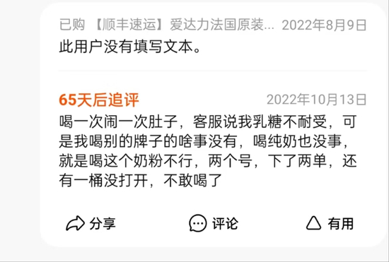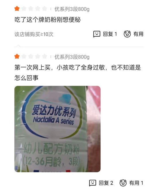 另外,还有消费者评价称,孩子在食用爱达力优系列奶粉后,还出现了便秘、过敏等症状。