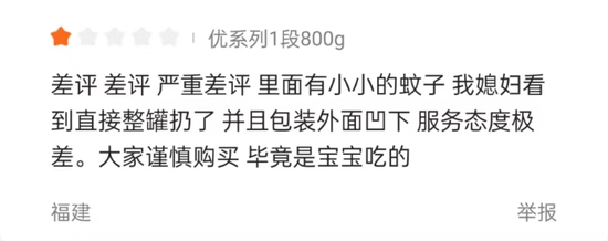 在爱达力京东自营官方旗舰店中,大公快消注意到,有消费者在购买爱达力优系列奶粉时,在产品内发现了蚊子,为此,消费者只能将整罐奶粉全部扔掉,同时,该消费者提醒到,大家谨慎购买,毕竟是宝宝吃的。