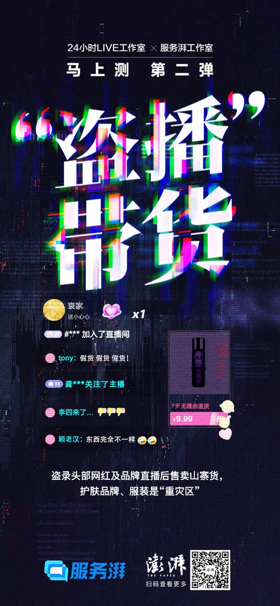 一不愿透露姓名的服装带货博主告诉澎湃新闻,自创品牌的服装直播频繁被“盗播”,并转到其他平台进行所谓的循环“直播”,而这些“盗播”的账号售卖仿制的服装,部分销量甚至超过自创品牌自己的直播,“每一场都被盗播,举报都举报不过来”。