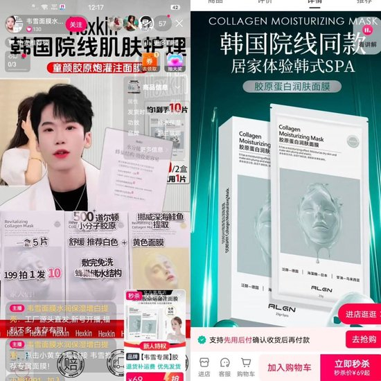 2024年12月31日,名为“秋秋爱护肤”的抖音账号正在进行秋瓷炫的带货直播。直播画面里,秋瓷炫在介绍一款Liar品牌的水光胶原蛋白面膜,但右下方显示“讲解中”的产品,却是SXCS品牌的童颜胶原炮灌注面膜,售价199元两盒。两款产品外观、名称十分相似,不仔细分辨很容易买错。