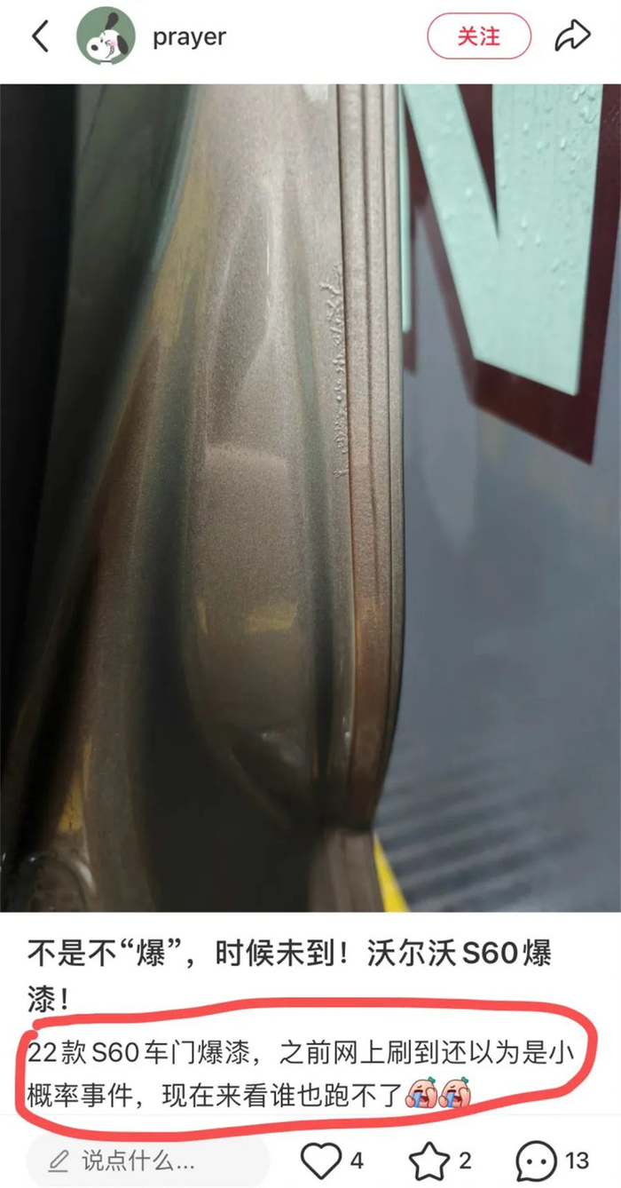 “22款S60车门爆漆,之前网上刷到还以为是小概率事件,现在看来谁也跑不了。”