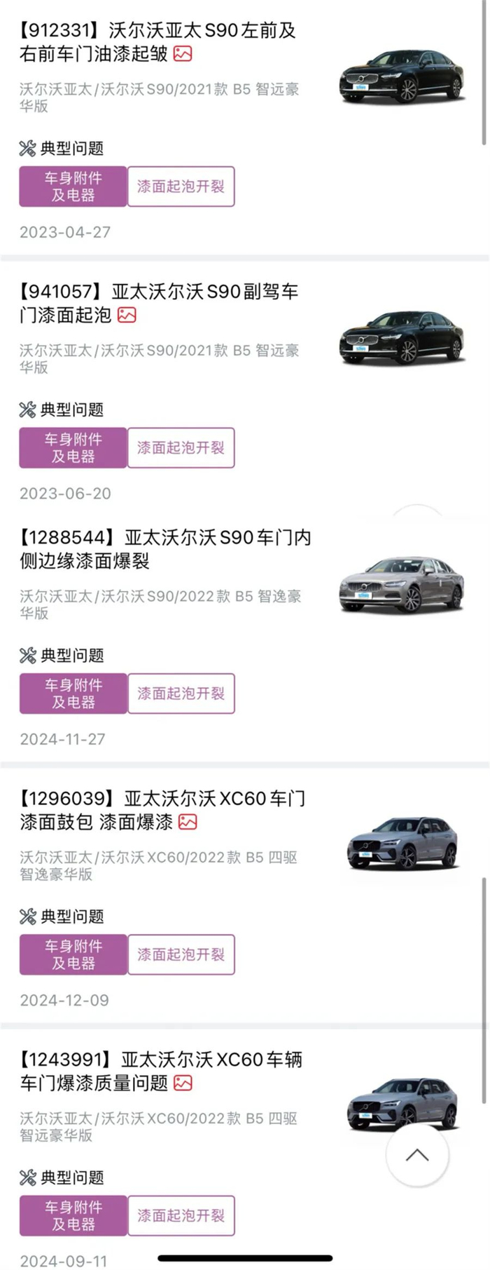 娱乐圈有大名鼎鼎的“艳照门”。沃尔沃有不遑多让的“爆漆门”。关于沃尔沃车门爆漆的帖子,数不胜数,最早可追溯到2022年,最新的则是今年。涉及的车型涵盖沃尔沃XC60、S90等。