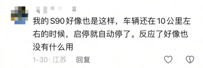 “我的S90好像也是这样,车辆还在10公里左右的时候,启停就自动停了。反映了好像也没什么用。”