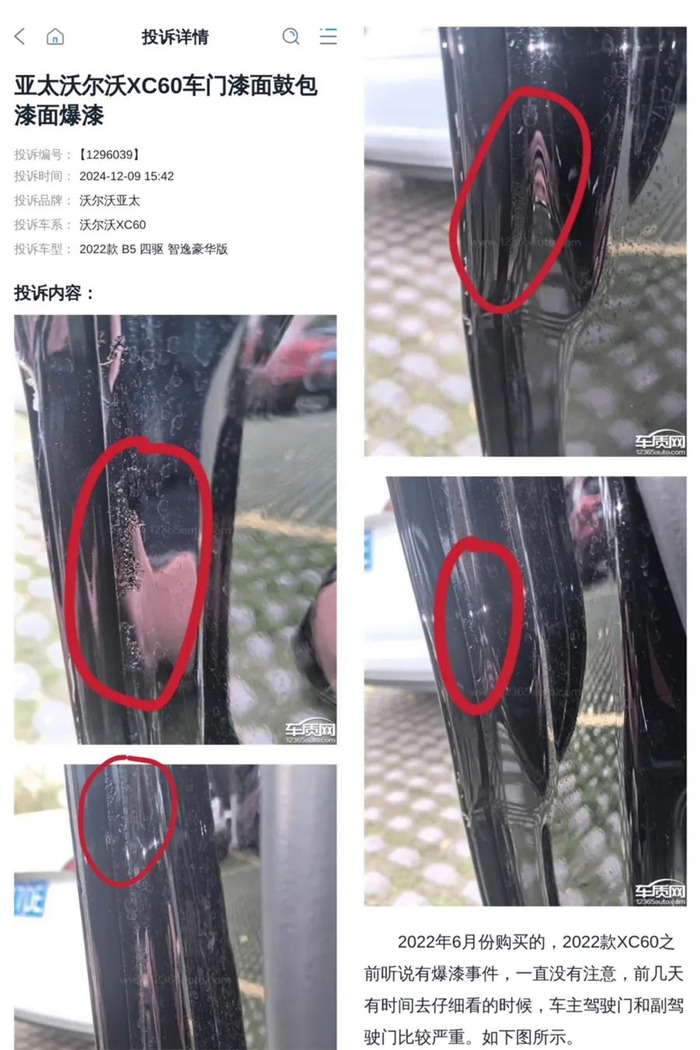 投诉内容:“2022年6月份购买的,2022款XC60之前听说有爆漆事件,一直没有注意,前几天有时间去仔细看的时候,车主驾驶门和副驾驶门爆漆比较严重。”