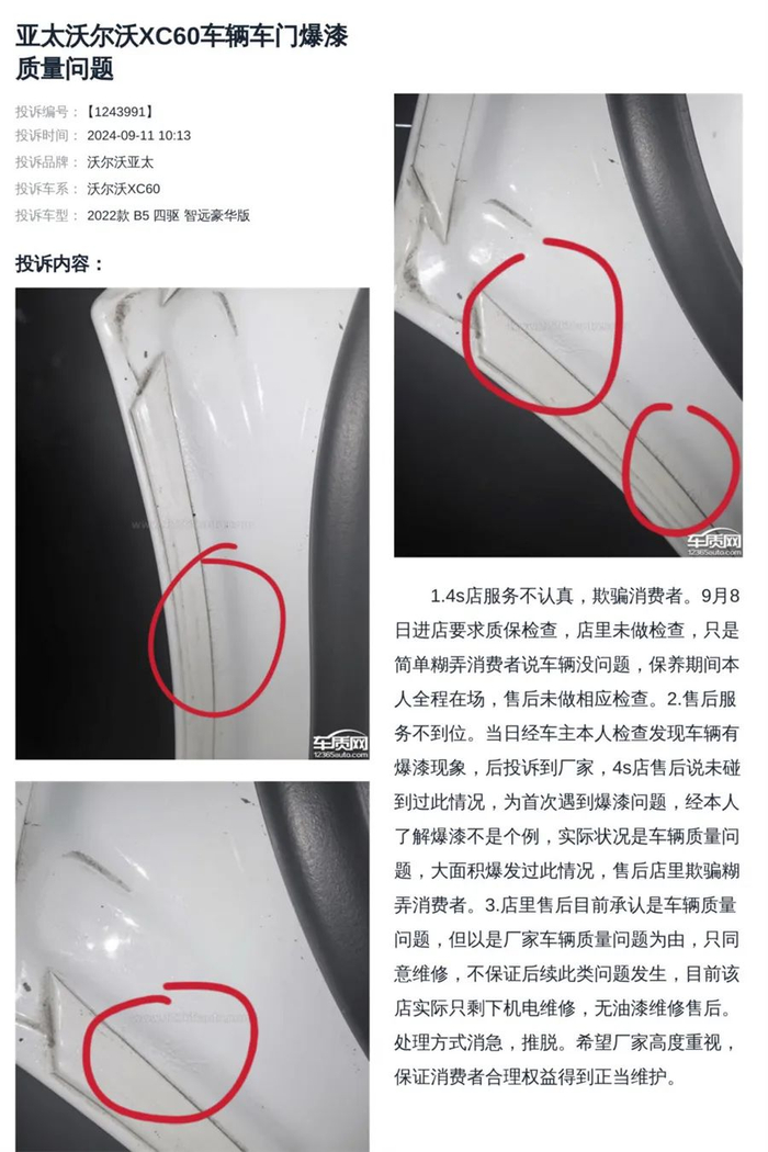 部分投诉案例3:亚太沃尔沃XC60车门漆面鼓包漆面掉漆