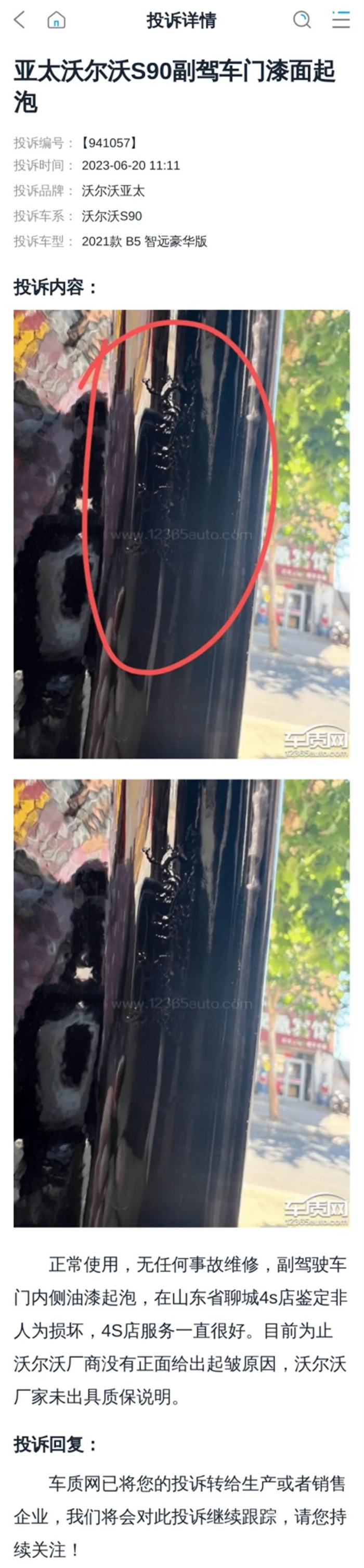 部分投诉案例1:亚太沃尔沃S90副驾车门漆面起泡