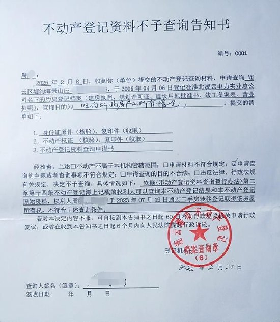 2月26日,盖有连云港市不动产登记档案查询章的《不动产登记资料不予查询告知书》显示,经核查,申请查询的主题或者查询事项不符合规定。认为周先生通过二手房转移登记取得该房屋所有权,不符合查询条件。