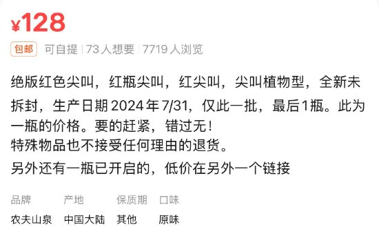 据商家的售卖信息显示,这批绝版“红色尖叫”生产日期在2024年7月31日前后,全新未拆封,保质期为12个月,即将到达保质期限。卖家称“仅此一批,最后一瓶,错过无”。另外,还有链接售卖“已开启的”尖叫。