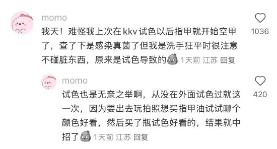 对此,有网友表示,自己曾在KKV试色以后指甲就开始空甲了,查了下是感染真菌了,才发现原来是试色导致的,“但是试色也是无奈之举,没想到就中招了。”