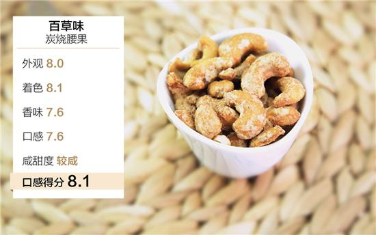 有趣的是,90名试吃员普遍反映最“咸”的腰果并非含盐量最高的来伊份,而是百草味。而来伊份的口感却被认为是最“甜”。
