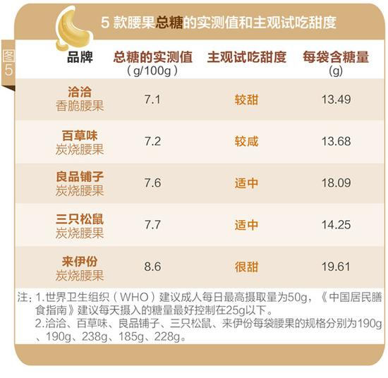 检测结果显示,5款腰果的糖含量相差不大,平均含量为7.6%。来伊份不仅盐含量最高,糖含量也领先于其它四款,这对于部分消费者来说并不是一个好消息。
