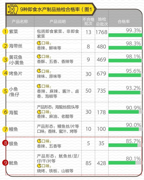 抽检数据显示,上述9种常见休闲海味共抽检4872批次,平均合格率达到92.4%。