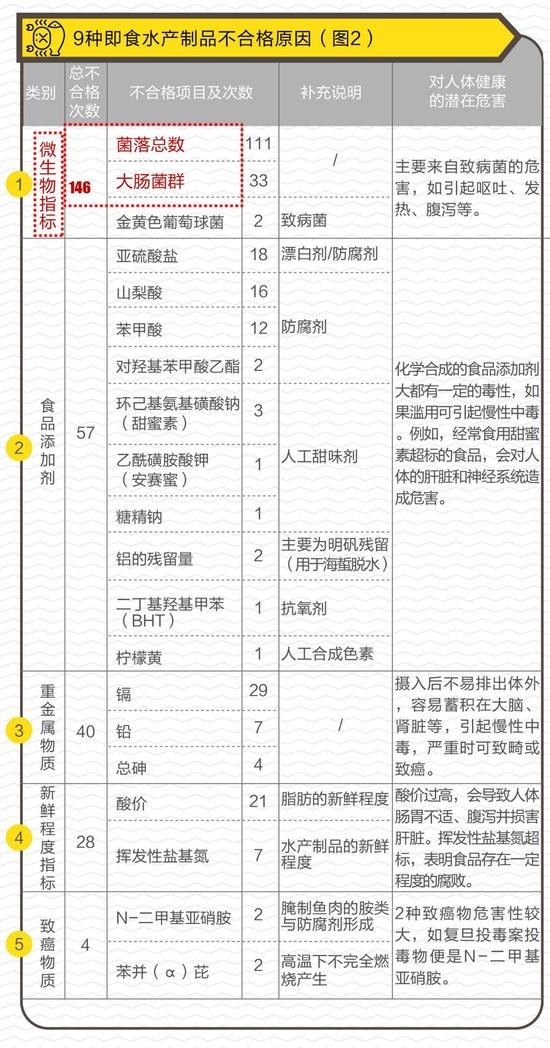 抽检数据显示,9种休闲海味的不合格原因涉及菌落总数、大肠菌群、镉、酸价、亚硫酸盐等20个项目。