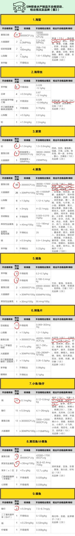 为了让你在吃货的道路上完美避坑,消道长整理了这9种休闲海味的不合格项目检出情况以及检出不合格产品的品牌。(如图3)