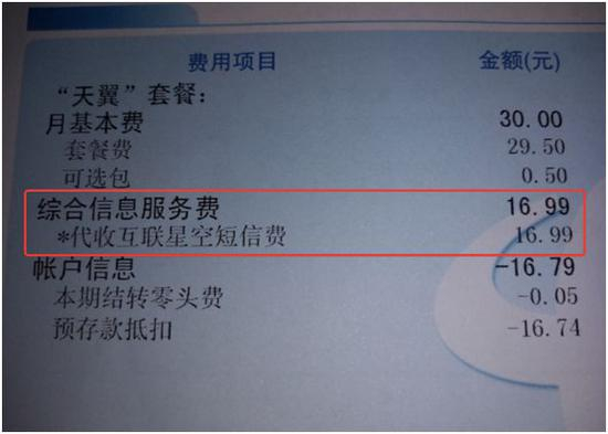 今年5月,记者收到本人电信账单时发现,里面一项名为“代收互联网星空短信费”的综合信息服务费,每个月都是16.99元,迄今大约已连续支付了6个月。如下图。