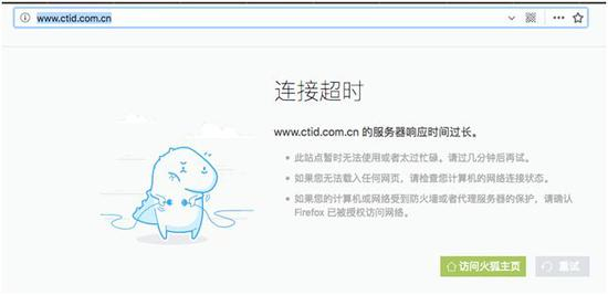然而,就是这样一家注册资本3000万元国企的官方网站(www.ctid.com.cn),从证券时报记者介入调查起,就一直处于无法打开的状态。如下图所示。