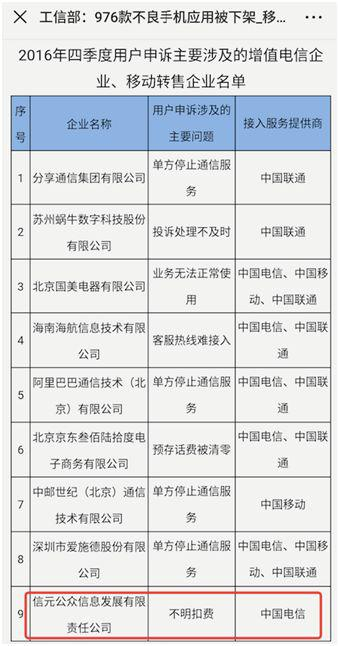 信元发展无疑是一家非常低调的公司。但尽管如此,记者还是发现,中国质量新闻网2017年2月披露,工业和信息化部官网通告了2016年四季度及全年电信服务有关情况,其中,用户申诉主要涉及的增值电信企业、移动转售企业名单中,信元公众信息发展有限责任公司赫然在列,其被用户申诉的主要问题是“不明扣费”。而在该榜单的所有9家受通报企业中,信元发展是唯一一家被诉“不明扣费”的企业。相比其他8家被投诉的“业务无法使用”、“停止通信服务”等问题,信元发展暗自扣取用户费用,应该是比较严重的涉嫌违法行为。
