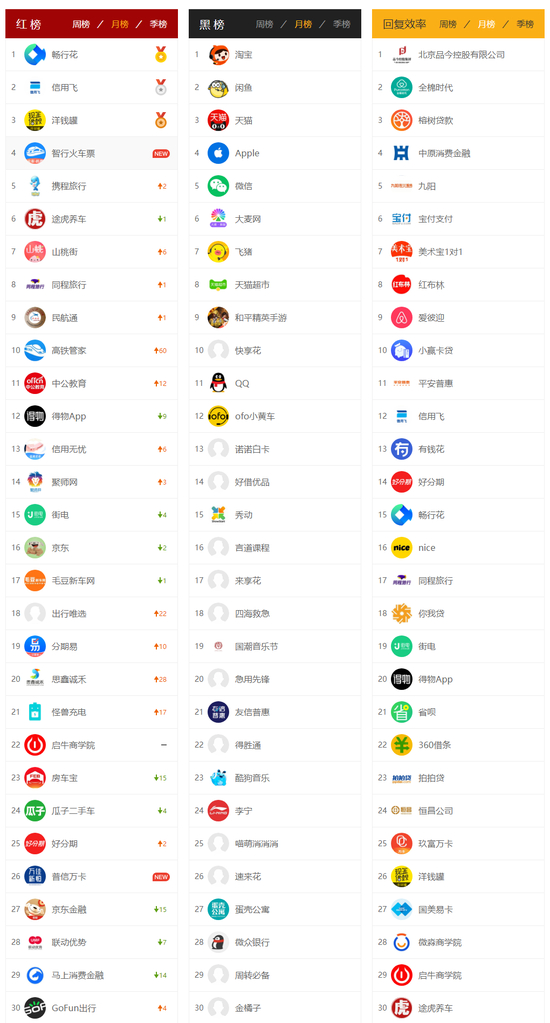 红榜:畅行花、信用飞、洋钱罐、山桃街、信用无忧、分期易、好分期、普信万卡、京东金融、联动优势