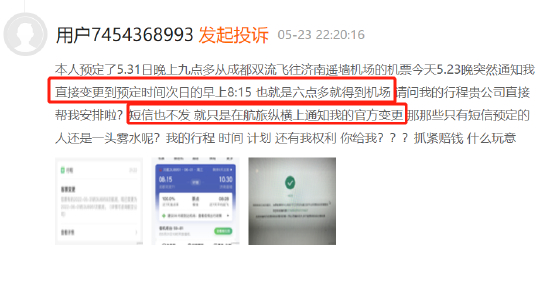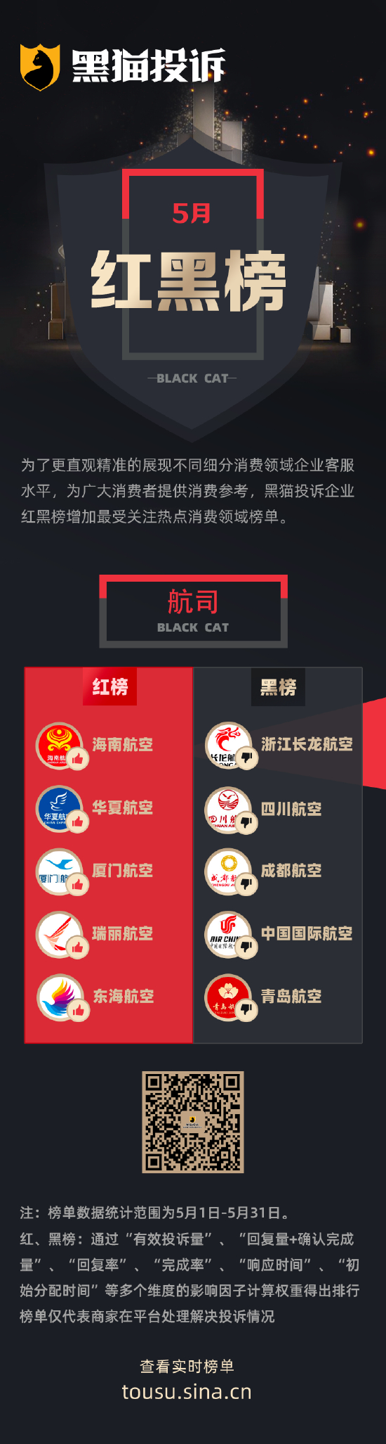 5月黑猫投诉航司领域红黑榜——四川航空未经允许强制更改班次