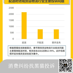 根据黑猫投诉数据显示,春节期间货运物流行业投诉问题主要围绕配送时效,相关投诉占比达到62.94%。此外包括损坏丢失相关投诉也较为集中。