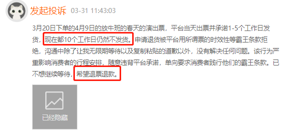 本月中,有不少用户在黑猫投诉平台投诉称在大麦网购买了演出票,平台承诺在1-5个工作日内出票,但未按照约定时间出票,且平台不退款。此外,还有大量消费者表示在大麦网上购买了演唱会门票,自身无法前往,但大麦网不予退款。截止3月底,大麦网在黑猫投诉平台累积投诉约12000单,回复率不足25%。