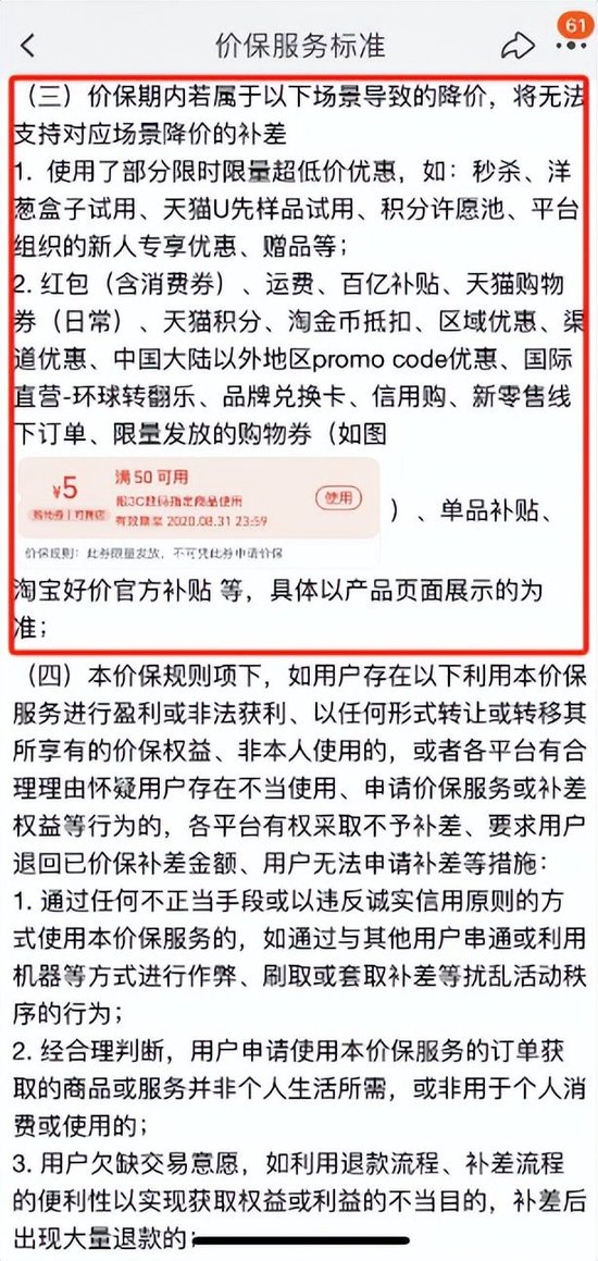 关于平台的价保协议,未来网记者查询到,在天猫、淘宝平台的价保服务标准中,红包(含消费券)、运费、百亿补贴、天猫购物券(日常)、天猫积分、淘金币抵扣、区域优惠、渠道优惠、中国大陆以外地区promo code优惠、国际直营-环球转翻乐、品牌兑换卡、信用购、新零售线下订单、限量发放的购物券单品补贴、淘宝好价官方补贴等,具体以产品页面展示的为准,将无法支持对应场景降价的补差。