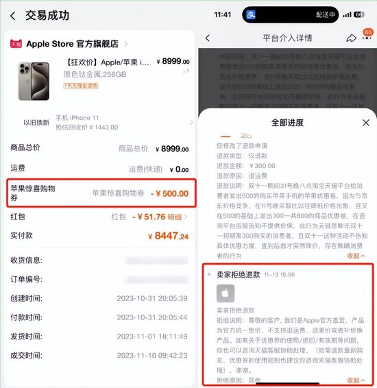 10月31日,梁先生支付了8447.24元在天猫Apple Store官方旗舰店购买了一台原色钛金属256GB的iPhone15Pro,其中使用了苹果惊喜购物券500元,红包51.76元。